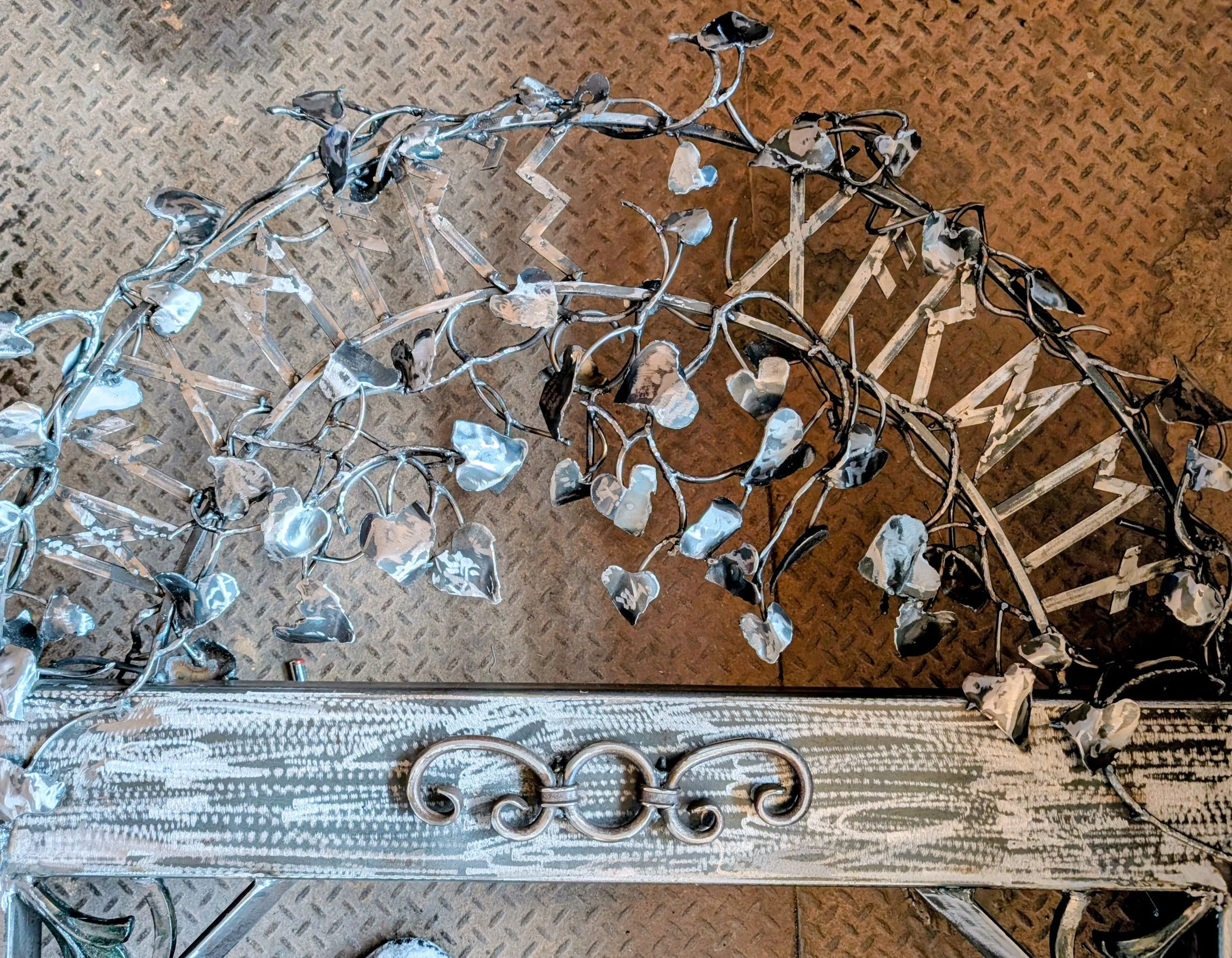 This tall structure will be installed at the beginning of a path to a backyard garden, serving as a gateway to a space honoring a loved one. The person’s name, along with the word garden, is written in runes, a German language. Steel vines wrap around all four sides of the structure from top to bottom. Each was plasma cut, hammered, and welded one by one. They represent time passing and the integration of nature overtaking a conservative form.
